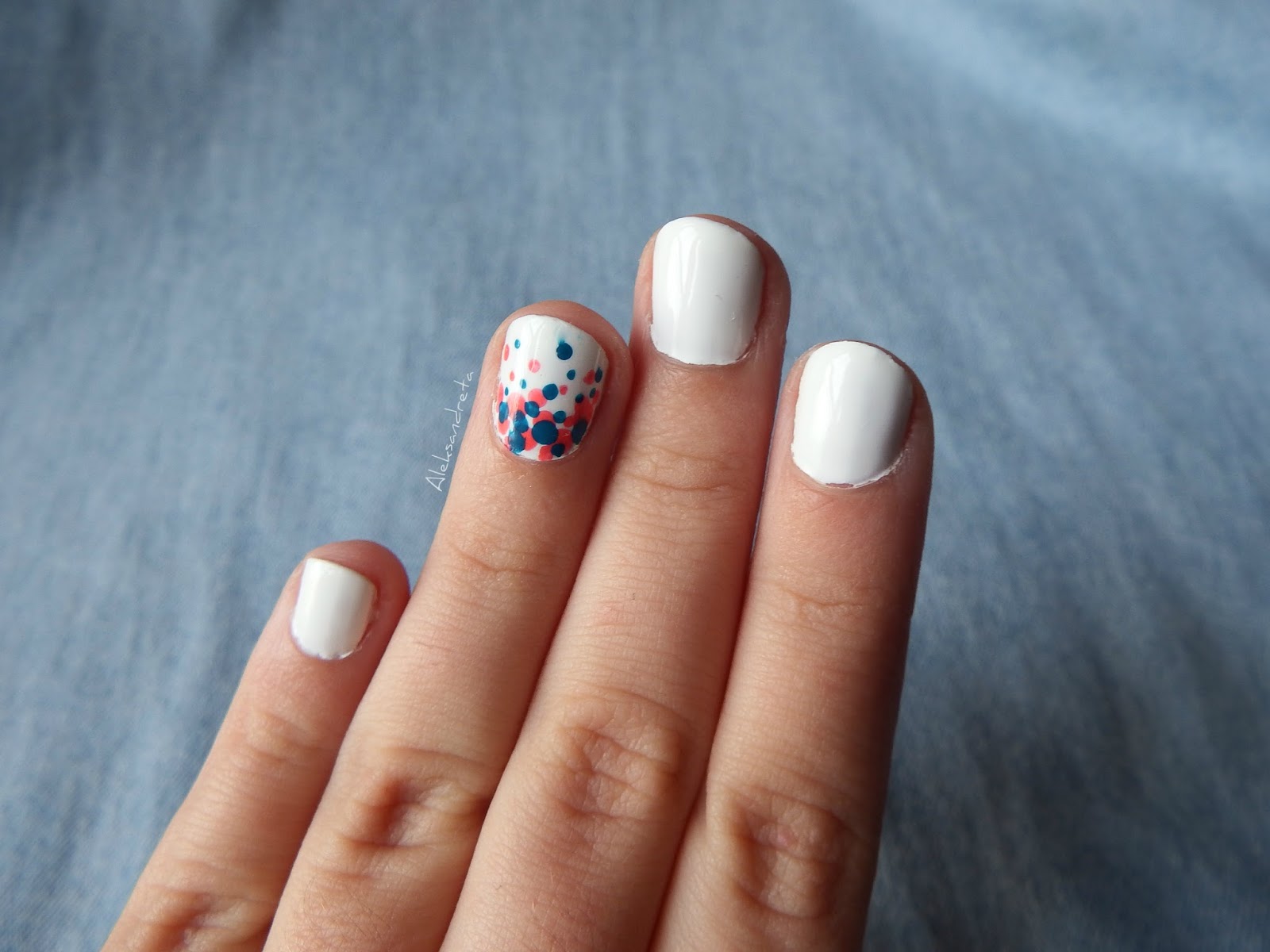 Temperatura na zewnątrz zaowocowała paznokciami dość nietypowymi na tę porę roku. Nie mogłam się powstrzymać i połączyłam biel z niebiesko-różowymi kropkami na palcu serdecznym i kciuku. Pomysł ściągnęłam z jednego z moich ulubionych lakierowych blogów The Nailasaurus. Jeśli jeszcze go nie znacie to koniecznie nadróbcie zaległości, bo dziewczyna robi genialne rzeczy i udowadnia, że na krótkich paznokciach również można wyczarować coś pięknego. ;)